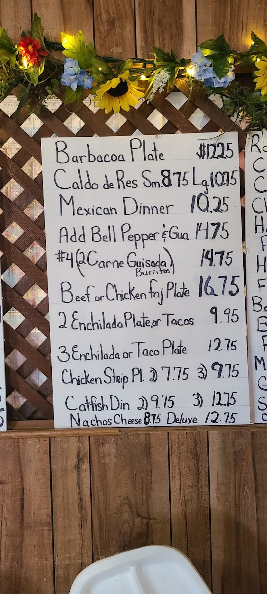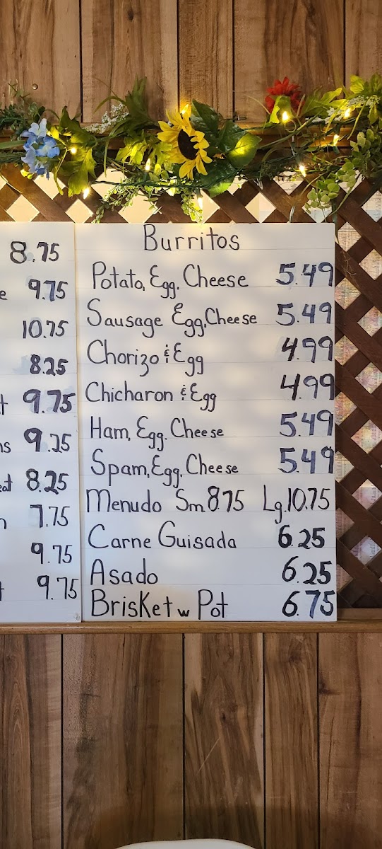 The menu is structured to accommodate quick orders or casual sit-down meals, with a focus on authentic, home-style Tex-Mex cuisine. The offerings are suitable for those seeking a filling breakfast or a more substantial lunch.