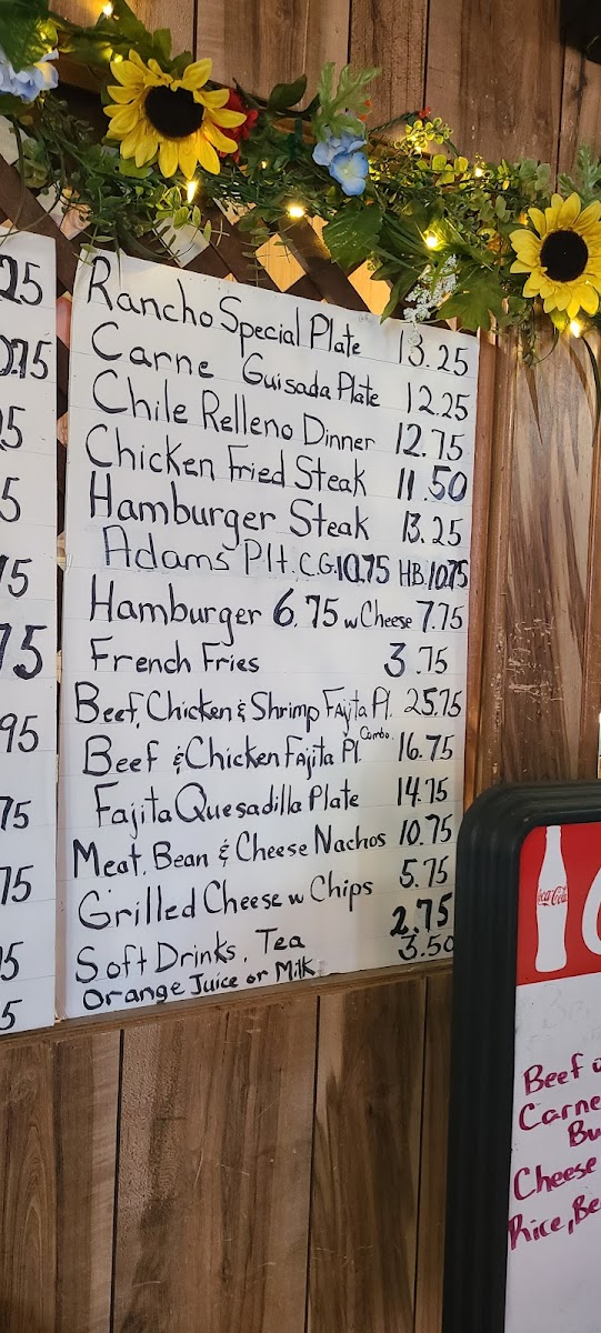 Food options include breakfast staples such as breakfast burritos, huevos rancheros with chorizo, and dishes like caldo de res and menudo. Entrées often come with traditional sides like rice, beans, and handmade flour tortillas. Other notable items include enchiladas, carne guisada served with potatoes, rice, and beans, as well as specialty plates like The Adam Plate.